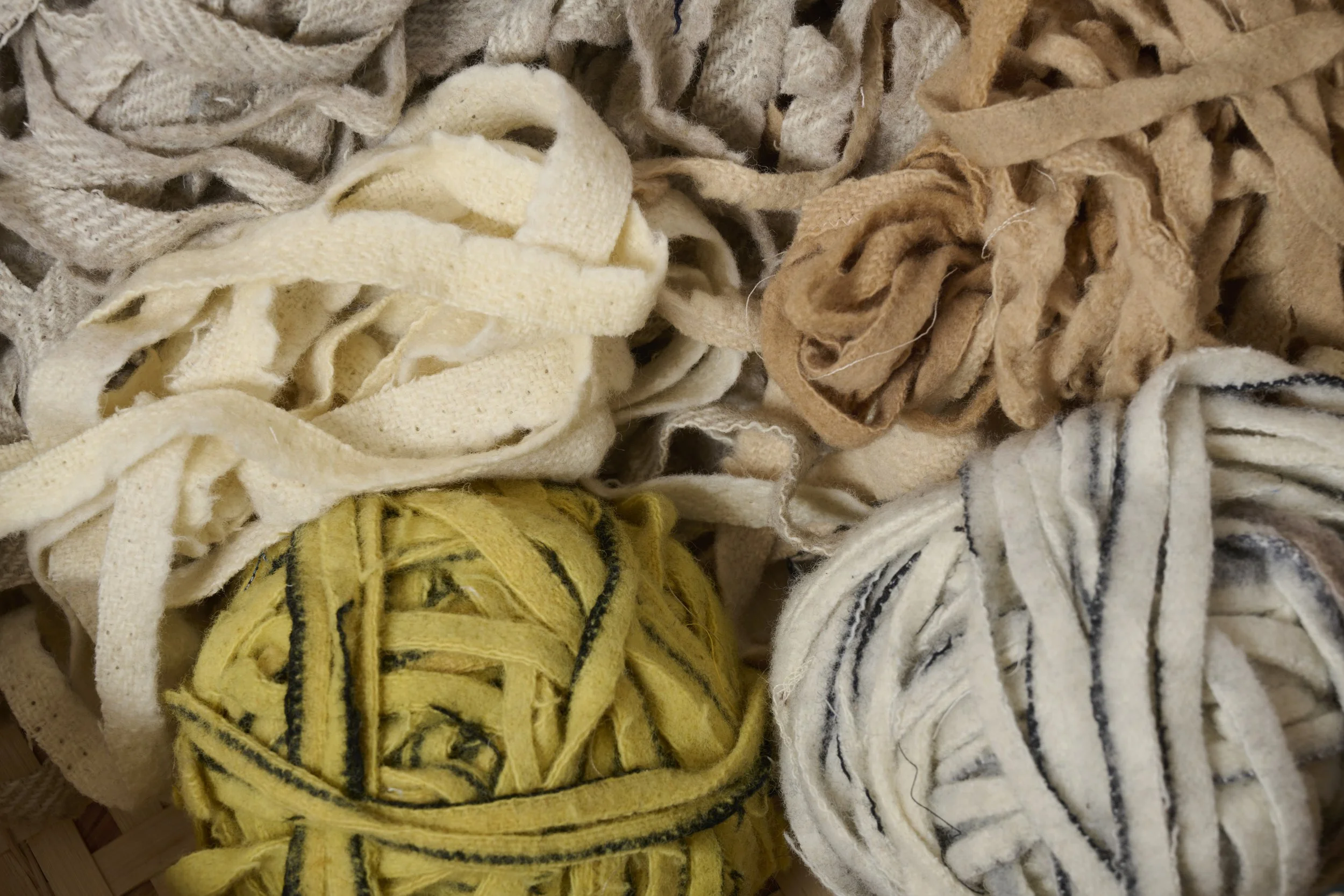 I repurpose Pendleton wool blanket selvedges that would otherwise go to landfill, rolling them into “yarn” for rugs and wall pieces. Sometimes these are naturally dyed for added color.
